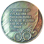 На реверсе медали мы воспроизвели цитату основателя музея Харитона Ивановича Попова. Это был выдающийся человек, прекрасный историк. Он работал в различных земских и войсковых учреждениях. Уделял большое внимание вопросам донской истории и археологии. Выступал с докладами по этим темам в Вильно, Москве, Харькове. Много публиковался в «Памятных книжках» Донского статистического комитета. Он – автор «Краткого очерка Донского казачества», других трудов по истории казачества. Так что имя Попова вполне логично запечатлено на юбилейной медали.