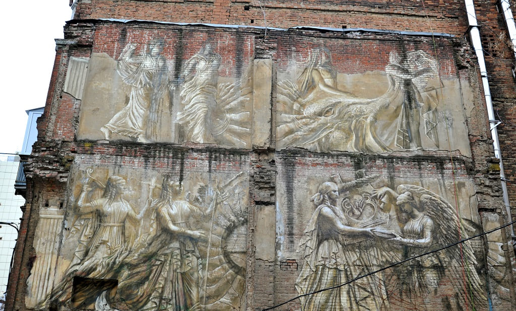 С конца октября к этой стене, примыкающей к внутреннему дворику Ростовской государственной консерватории им. С.В. Рахманинова (со стороны ул. Шаумяна) было приковано внимание почитателей ростовской старины, журналистов местных СМИ. Ведь буквально на глазах прохожих на ней возникали женские фигуры в античных одеждах.