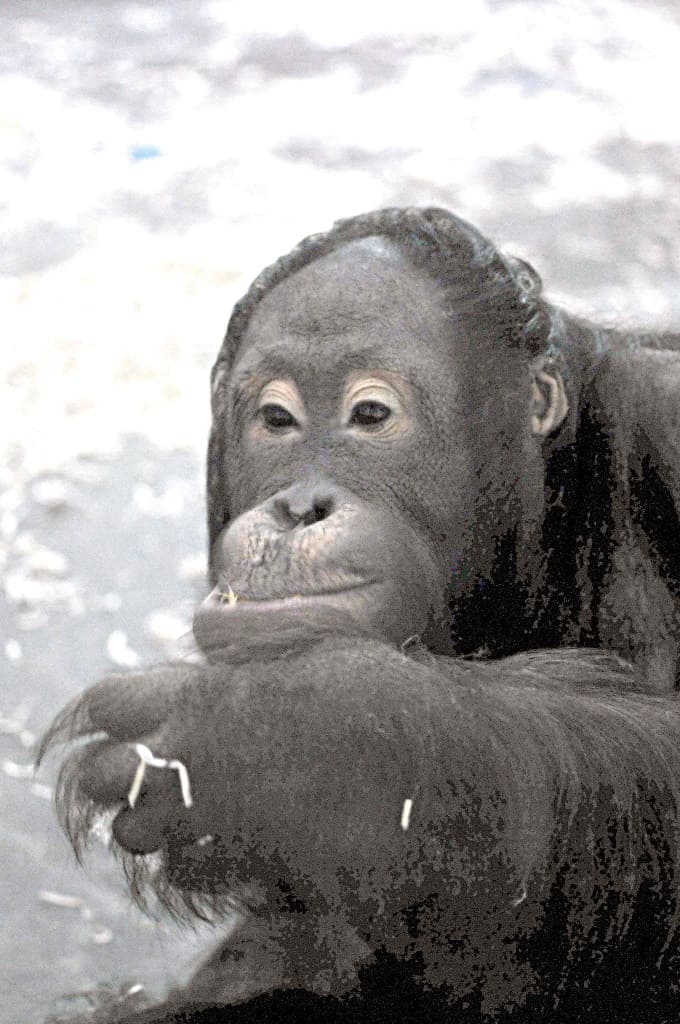 Часть съестного орангутану требуется не просто взять из миски, а самостоятельно отыскать в вольере. Такие задачки придумывают для него сотрудники зоопарка. Считается, что это способствует развитию интеллекта у животных.