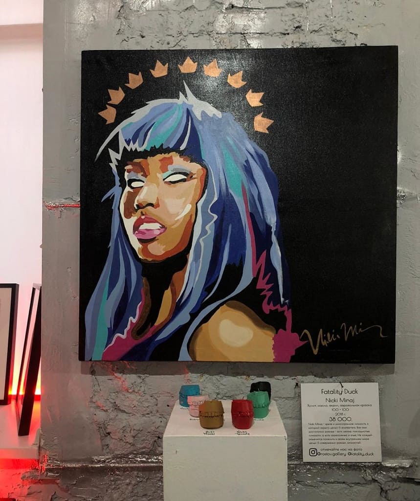 Ники Минаж. Рисунок выполнен маслом, акрилом и аэрозольной краской. Перед холстом - инсталляция об альтер-эго певицы