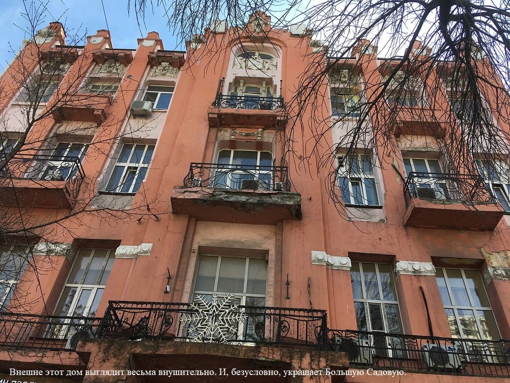 Монументальное здание по Большой Садовой, 78 было построено в 1896 году. Известно о нем немного: например, до революции в нем размещался Азово-Донской банк. В годы советской власти первые этажи здания использовались под магазины и конторы, на верхних этажах теснились жильцы многочисленных коммуналок.Старожилы помнят, что в начале перестройки в доме работала трикотажная фабрика.