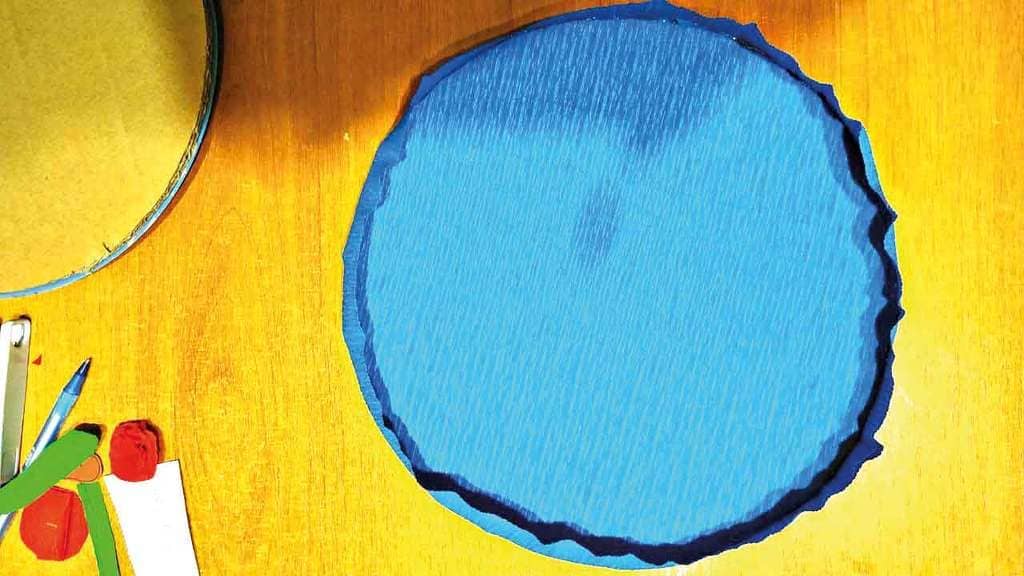 1. Из картона вырезаем круг, обклеиваем его бумагой и делаем бортики, чтобы наши кусочки не выпали.