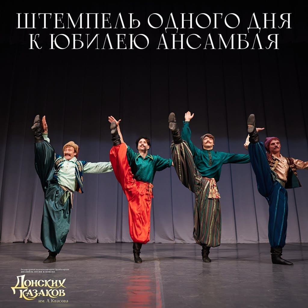 4 апреля коллекционеры, а также поклонники «Донских казаков» и просто все желающие смогут стать участниками торжественного гашения открыток уникальным юбилейным штемпелем одного дня. На открытках - красочные фрагменты концертных программ ансамбля. На оттиске штемпеля - графическое изображение танцора в виртуозном прыжке.