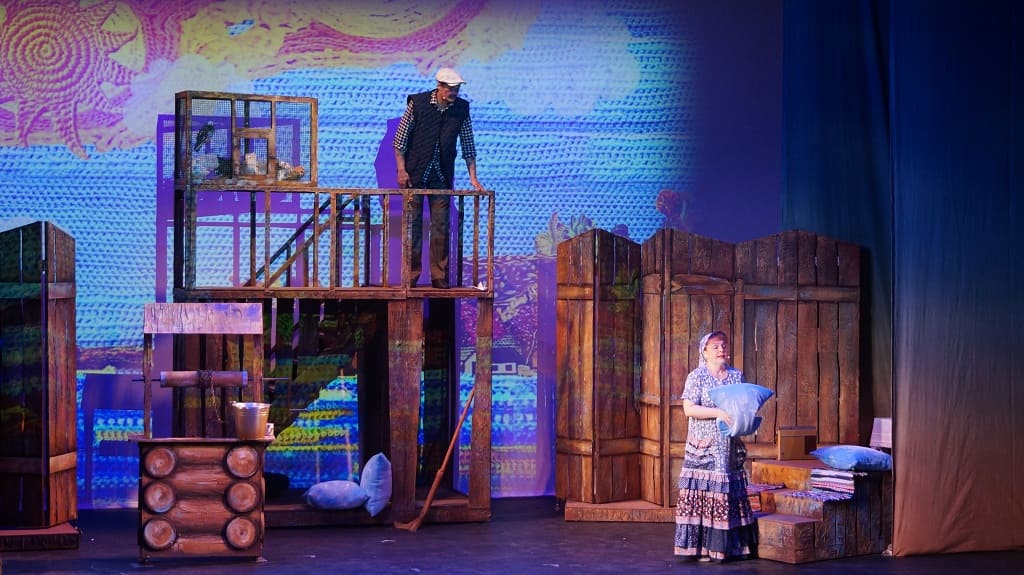 При этом театр, конечно же, создает свое село Алехино и его обитателей. Интересный художественный образ этого села предложила художник-постановщик спектакля Екатерина Ляхова. Пейзаж за окном - словно нитяная картина, вывязанная добрыми руками народных умелиц.