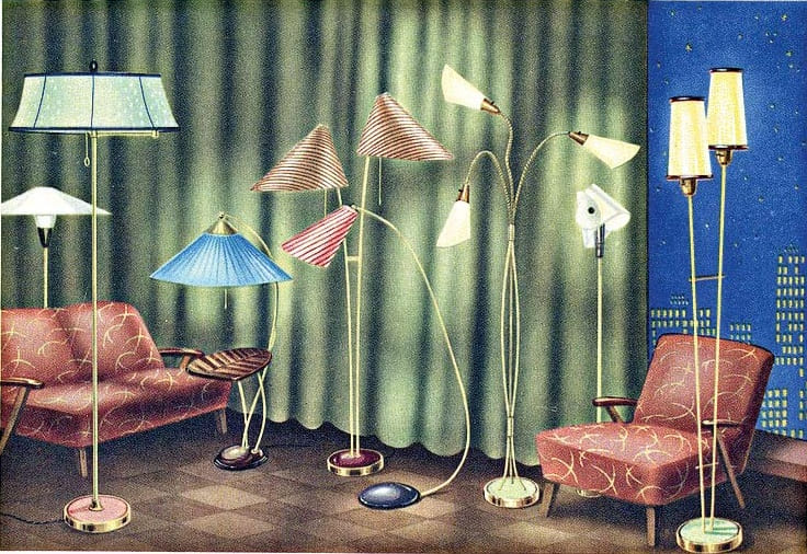 Спрос на абажуры достиг пика на рубеже 50–60-х годов, как и на хрустальные подвески люстр и яркие плафоны разных форм из стекла и пластика. В начале 60-х абажуры стали делать из разноцветного стекла. Вскоре в моду вошли плафоны. Как раз в это время государство начало великое переселение людей из старого жилья в новые, названные позже «хрущевками» квартиры. И во многих обязательным предметом интерьера являлся торшер. В те годы новоселы гонялись за импортными светильниками. Самыми популярными считались торшеры производства Чехословакии и Германской Демократической Республики. Подкупало качество работы и необычный дизайн светильников. Абажуры на торшеры изготавливались в основном из полимерных материалов, не отличающихся высокой прочностью, а лампы накаливания грели будь здоров как. По этой причине абажуры часто прогорали.
