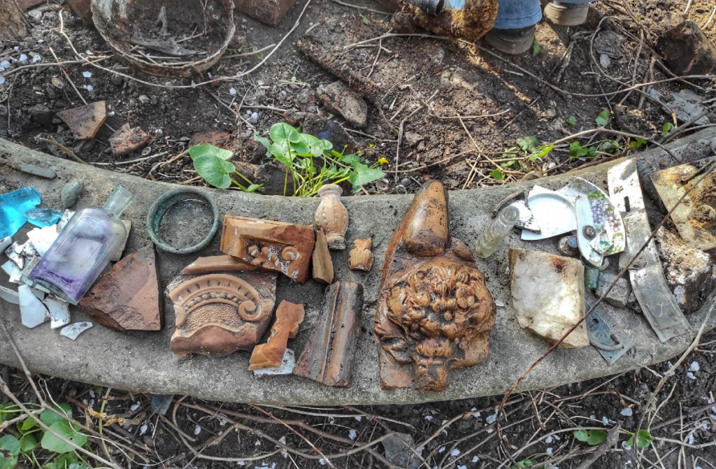 При исследовании заброшенного фонтана волонтеры обнаружили подшлемник немецкого солдата, фрагменты цветочных букетов, выполненных из керамики в стиле модерн.