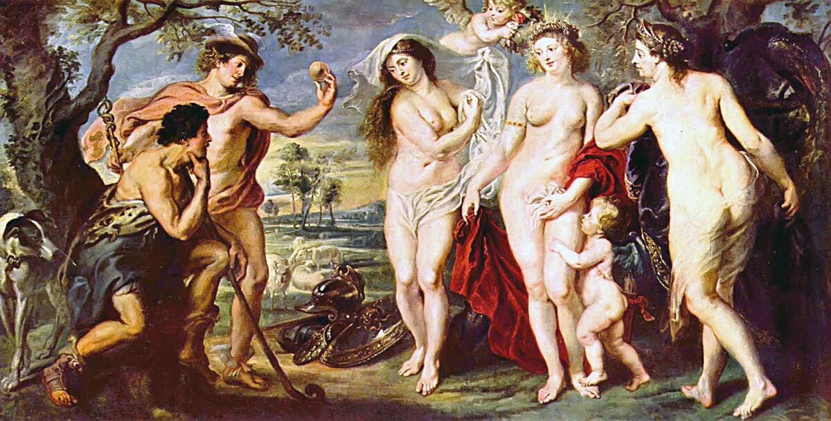 Это по античному мифу. Боги-олимпийцы устроили пир, Эриду на него не пригласили, и она, богиня раздора, в отместку решила их перессорить. Подбросила на пиршественный стол золотое яблоко с надписью «Прекраснейшей». И три богини – Гера (в римском варианте – Юнона), Афродита (Венера) и Афина (Минерва) – заспорили, кому оно предназначено. Судьей в этом споре выбрали красавца-пастуха Париса. Он отдал яблоко богине любви Афродите (Венере).