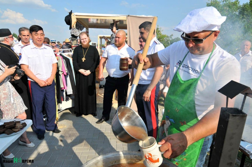 Символический старт празднику дал заместитель губернатора Ростовской области Александр Скрябин. Он посетил подворье казаков Рязановых, где по традиции окунул в уху вишневую головню. По словам старожилов, это делается, чтобы кушанье приобрело характерный вкус кострового дымка.
