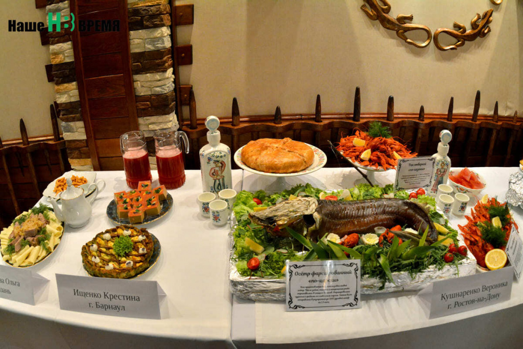 Шикарно фаршированный осетр в донской зелени и в окружении овощей, лимонов и раков смотрелся как картина на выставке. В жабрах блестела яркая блесна, и если приглядеться, можно было увидеть леску и удочку. Вот такая рыбалка. А еще – наши донские раки, приготовленные по классическому и казачьему рецептам. Технологию приготовления можно было узнать на красивых табличках, стоящих рядом. Это ноу-хау мужа нашей конкурсантки – Николая, кстати, отличная идея, сразу понятно, что за блюдо и как оно готовилось.