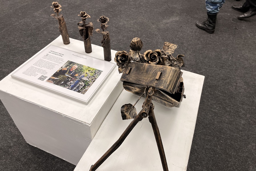 На выставке можно увидеть и сопутствующие экспонаты, рассказывающие о сегодняшнем Донбассе. Любому посетителю разрешается может примерить 45-килограммовый: бронежилет военкора. Здесь же – скульптурные работы донецких мастеров, выполненные из гильз…