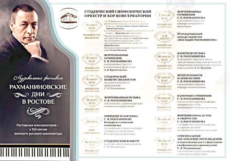 День рождения Сергея Рахманинова ростовские меломаны будут отмечать 1 апреля. В этот день в Музыкальном театре состоится гала-концерт с участием солистов, хора и оркестра. По словам главного дирижера Андрея Иванова, программа составлена таким образом, чтобы использовать все возможности театральной труппы. Филармония отметит юбилей премьерным исполнением рапсодии «Рахманинов» Евгения Кремнева. Дирижировать Ростовским академическим симфоническим оркестром будет заслуженный артист России Валерий Платонов.