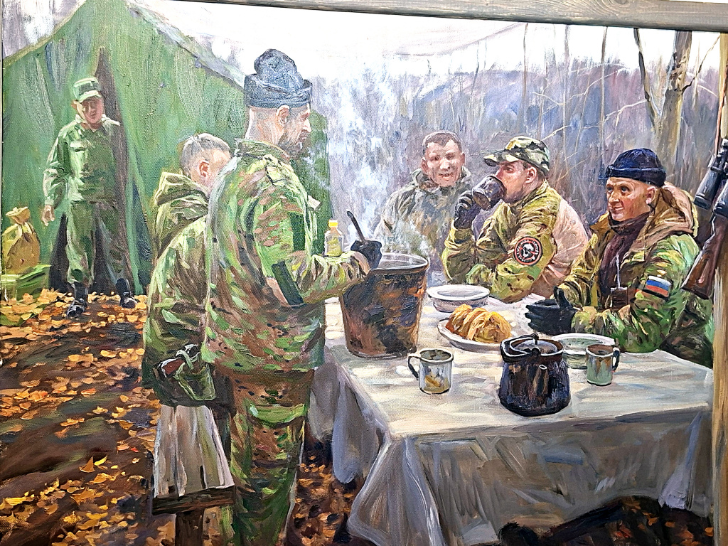 Драматическое полотно «Бой», полная светлой веры картина «С Божьей помощью», бытовой сюжет «Война войной» – обед бойцов на передовой…