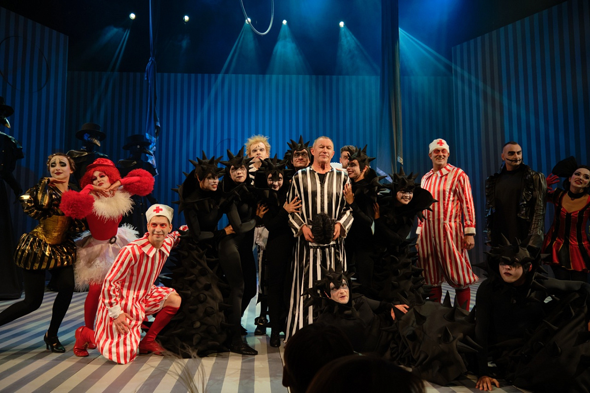 У Аргана с Диафуарусами – отцом и сыном – схожие костюмы: у Аргана – в черную полоску, у его врачевателей – в красную. Логично, поскольку они, по существу, одна «команда»: Арган – мнимый больной, они – мнимые доктора. Входы и выходы в жилище страдальца выглядят как огромные лекарственные облатки (сценография и костюмы Виктора Герасименко). Ну, и почему бы «целителям» (в этих ролях Артем Шкрабак и Никита Петров) не воспользоваться наивностью пациента, который двинулся умом на почве совершенно необоснованных подозрений? Сергей Власов и играет этот «сдвиг по фазе», касающийся не только Арганова здоровья. Хозяин богатого дома принимает за чистую монету лепет жены Бедины (Анна Гайдамак), которая лебезит и ластится к нему. Лишь неоспоримые доказательства ее притворства, наконец, открывают ему глаза. Здравые мысли брата Беральда (Евгений Климанов) – для него открытие мира: «Говори, что хочешь, когда ты в мантии и в шляпе, и всякая галиматья покажется ученостью, всякая глупость сойдет за умные речи».