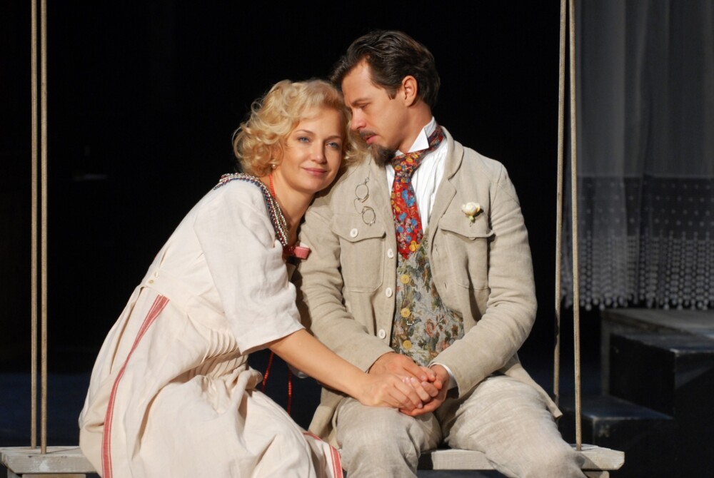Актер играет шута, но и персонаж дядя Ваня прикрывает ерничеством растерянность перед жизнью, которая пошла прахом. Тут все играют: на сцене выстроена еще одна сцена, а на стульях, стоящих сбоку от нее, дожидаются своего выхода другие исполнители. Доктор Астров (Виталий Кищенко) – циник в силу профессии, наверное. Зачем-то вызывающе демонстрирует дырку в носке. Вообще вида непрезентабельного. Трудно заподозрить его в любовной пылкости. Однако Елене Андреевне он, не церемонясь, заголяет юбку, и она застывает в непристойной позе – надо полагать, для того, чтобы вошедший с неуместным букетом Войницкий смог разглядеть пикантную сцену.