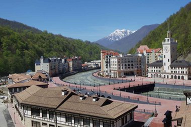 Центром нового горного курорта стал городок в долине реки Мзымты. Здесь уже работают пять отелей уровня 3-5 звезд, они входят в состав международных гостиничных сетей Radisson, Park Inn, Tulip Inn, Heliopark, Mercure. От этого городка к снежным трассам проложены линии канатных дорог. А каждый, кто впервые приезжает на курорт «Роза Хутор», приятно удивляется. В самом центре главной площади стоит изящная башня с часами. Она выполнена в том же стиле, что и знаменитая башня Сочинского железнодорожного вокзала. Такая архитектурная перекличка символична, она связывает морскую и горную части Сочи в единый город.