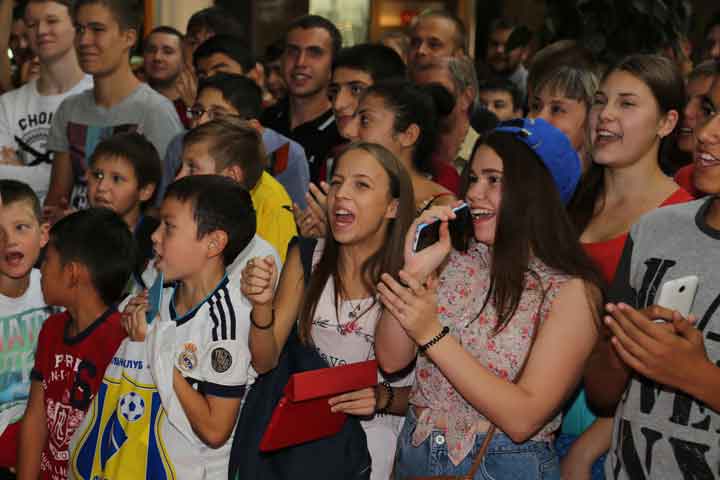 Ясно, что болельщики желали взять у футболистов автографы и сфотографироваться с ними вместе. Очередь выстроилась длинная, и запланированных 30 минут игрокам на это не хватило. Выход из положения был найден: футболисты с удовольствием сделали селфи со всеми, кто собрался у сцены.