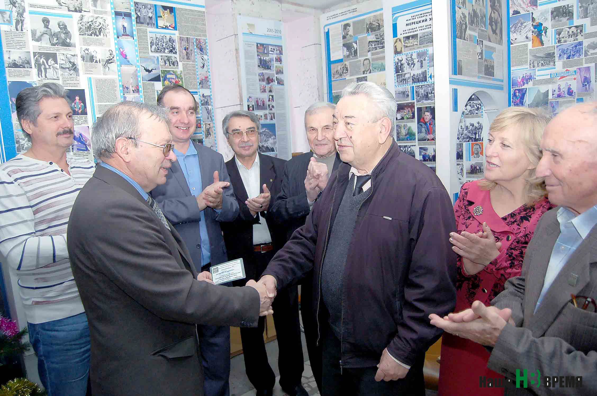 Почетный знак и удостоверение заслуженного путешественника России № 978 в клубе «Планета» вручил Виктору Андреевичу Дзюбе председатель ростовской организации спортивного туризма Михаил Сергеевич Рассудов (справа налево на переднем плане).