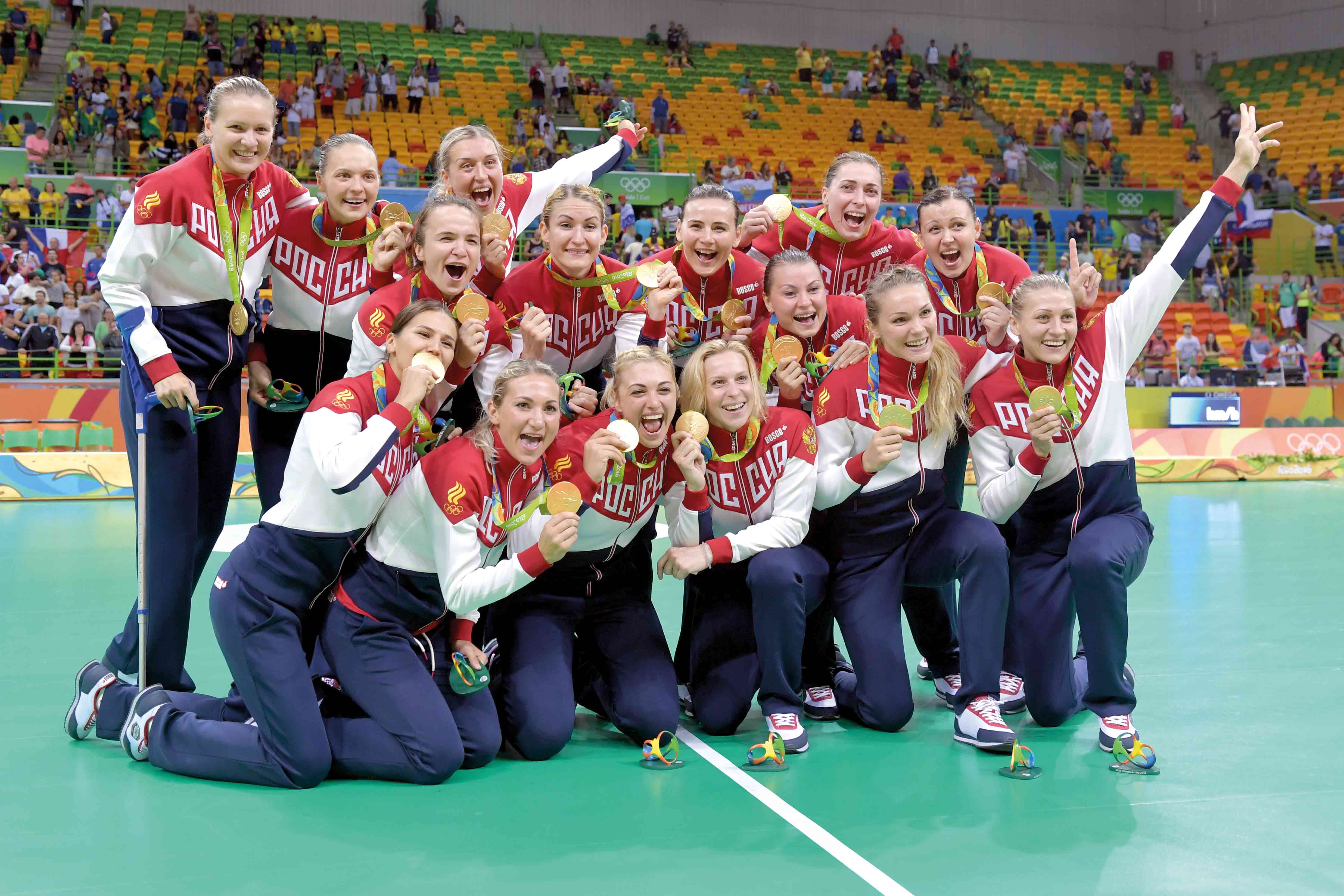 На верхнюю ступеньку пьедестала почета на Олимпийских играх поднимались синхронистка Влада Чигирева, гандболистки Анна Седойкина, Майя Петрова. Владлена Бобровникова, Анна Сень, Екатерина Ильина и Марина Судакова.