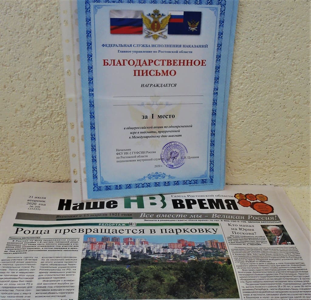 Когда в донской исправительной колонии № 2 награждали участников турнира, приуроченного к Международному дню шахмат, а газету «Наше время» удостоили грамоты пенитенциарного ведомства за информационную и организационную поддержку данного проекта (он — общероссийский, в рамках всей Федеральной службы исполнения наказания), руководство ФСИН России пообещало, что вскоре проведут всероссийский чемпионат среди осужденных. И вот он состоялся. Прошел в режиме видеоконференцсвязи.