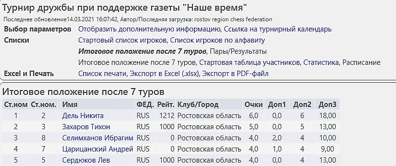 Участниками этого рапида были юные донские шахматисты. Чемпион набрал шесть из семи возможных баллов. Следом финишировал с пятью баллами Тихон Захаров. «Бронза» - у Ибрагима Селимханова, который набрал четыре балла и обошел по дополнительным показателям Андрея Царицанского и Льва Сердюкова (у тех тоже было по четыре балла). На международной шахматной платформе в
