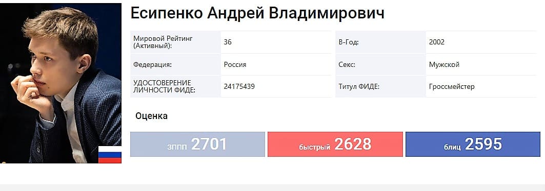 Причем, по линии сразу двух шахматных федераций — национальной и международной (ФИДЕ), которые обновили свои табели о рангах, где зафиксировали колебания в личном рейтинге за последний месяц каждого профессионального игрока. И официально зафиксировали зачисление Андрея Есипенко в ряды «семисотников» - так называют шахматистов, достигших рубежа в 2700 пунктов.