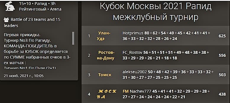 Победитель «Кубка Москвы-2021» определится по сумме выступлений в трех дисциплинах: кроме рапида будут зачтены командные выступления в блице и «пуле». Параллельно подсчитываются и колебания в личных рейтингах всех игроков.
