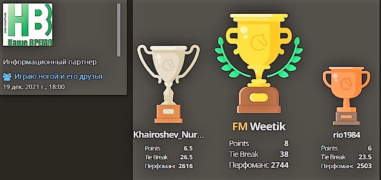 Убедительной победой мастера ФИДЕ из Каменска-Шахтинского Вячеслава Витика поздним воскресным вечером завершился межрегиональный онлайн турнир, посвященный юбилею члена сборной команды Ростовской, спикера проекта «Играю ногой и его друзья» Сергея Петровича Воскобойникова.