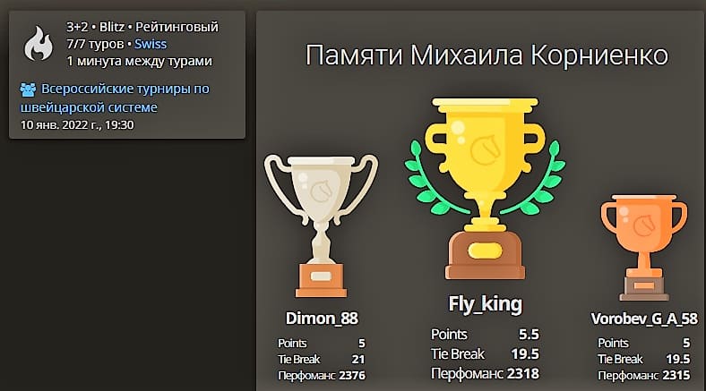 Десятого января поздно вечером игрок из Красного Сулина Михаил Чуев, который взял себе ник «Fly King» ( под ним он ранее вступил и в шахматное сообщество «Наше время-100») выиграл турнир памяти члена донской сборной, спортивного организатора из Большой Мартыновки Михаила Корниенко.