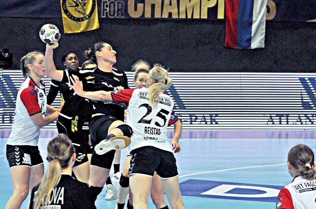 Хозяйки начали поединок спокойно и уверенно. Южанки все время вели в счете два-три мяча. Впрочем, скандинавки далеко уйти вперед не давали, подтягиваясь временами почти вплотную. На 23-й минуте главный тренер северянок Йенсен при счете 7:11 берет минуту. Она идет на пользу, и гости два мяча отыграли. На последних секундах тайма Кожокарь убегает в отрыв и забрасывает в угол ворот – 15:11. Стоит отметить, что в этом отрезке встречи отлично сыграли Манагарова, Бобровникова и Аморим, точна при исполнении штрафных была Заади.