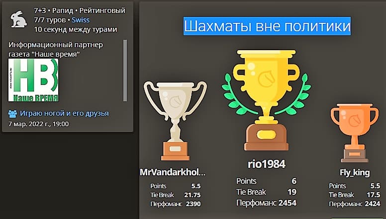 Рапид завершился победой шахматиста из Сальска Руслана Осиповича. Предыдущий турнир в рамках проекта «Играю ногой и его друзья» назывался «Нет войне» и закончился победой шахматиста из Каменска-Шахтинского Александра Стаценко.