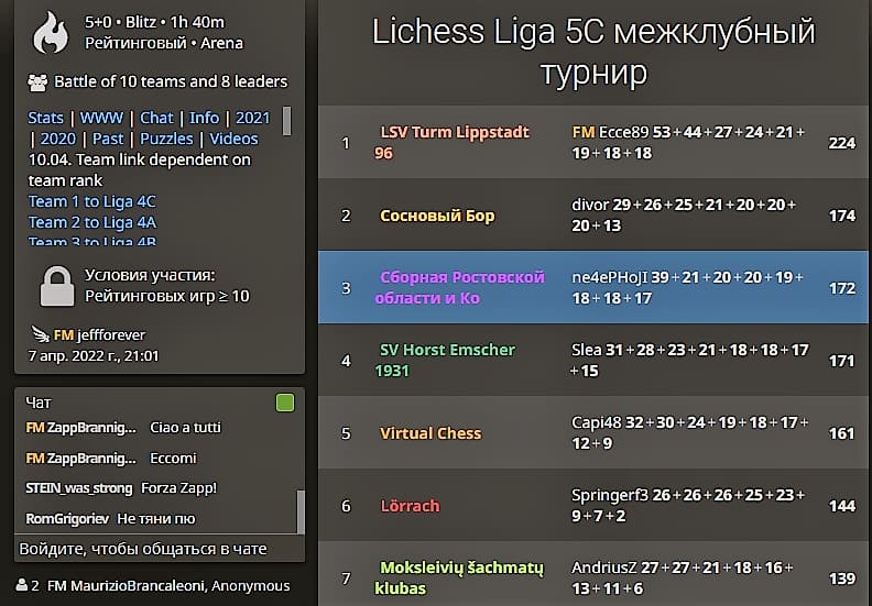 Дончане — завсегдатаи этих соревнований. Выступают, правда, нестабильно, балансируя между различными дивизионами Lichess Liga. Чаще так бывает, когда не удается собрать сильнейший состав.