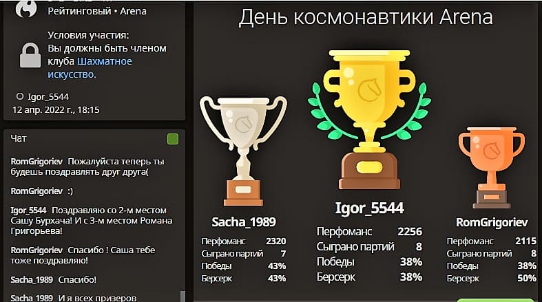 На международном сервере Lichess в рамках онлайн-сообщества «Шахматное искусство» вечером 12 апреля стартовал турнир, приуроченный ко Дню космонавтики.