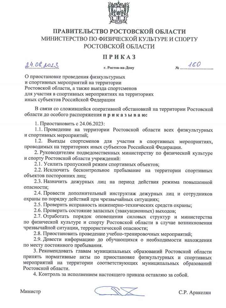 Сегодня министр по физической культуре и спорту Ростовской области Самвел Аракелян подписал приказ о приостановке проведения физкультурных и спортивных мероприятий на донской территории, а так же выезда спортсменов для участия в турнирах на территории других регионов.