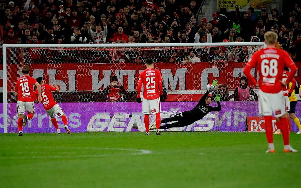 В конце тайма Мелехин , как уже бывало, привез в свои ворота пенальти-в падении зачем-то потянул за футболку Николсона. Кстати, арбитр нарушение не заметил-москвичам помог ВАР. Исполнять штрафной вызвался аргентинец Барко. До этого он пять раз точно бил с точки, но на сей раз не смог перехитрить Ятимова, который в прыжке отразил удар.