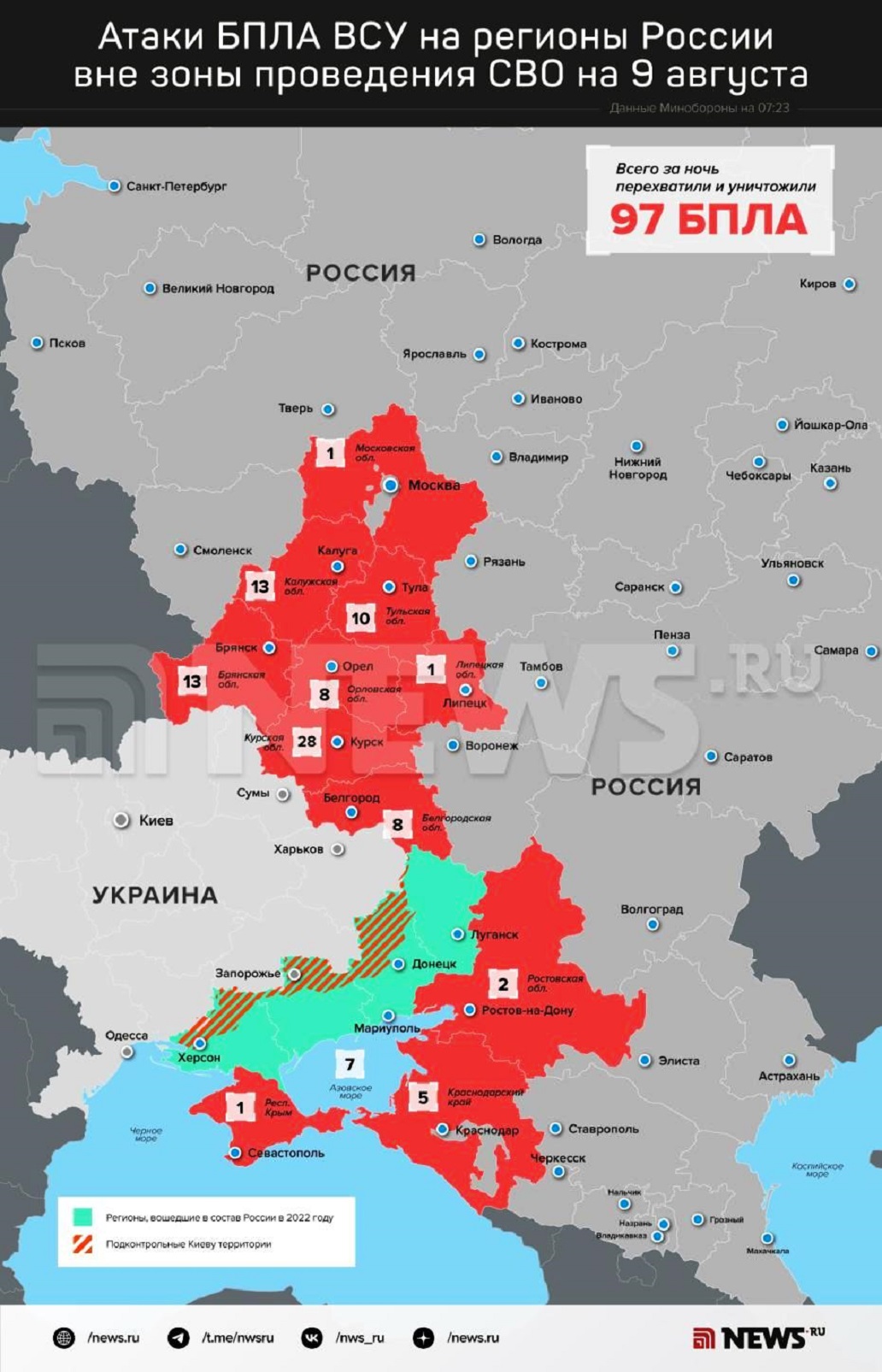 Всего над Россией подразделения ПВО перехватили и уничтожили без малого сотню вражеских беспилотников. Большинство из них (28) сбили над Курской областью. Еще по 13 — над Брянской и Калужской областями. С десяток БПЛА было ликвидировано в Тульской области. А в Орловской и Белгородской областях сбили по восемь дронов. В небе над Кубанью уничтожен пять БПЛА а над Крымом, в Подмосковье и в Липецкой области сбили по одному. Позже были перехвачены и уничтожены еще два беспилотника, летевшие непосредственно на столицу.