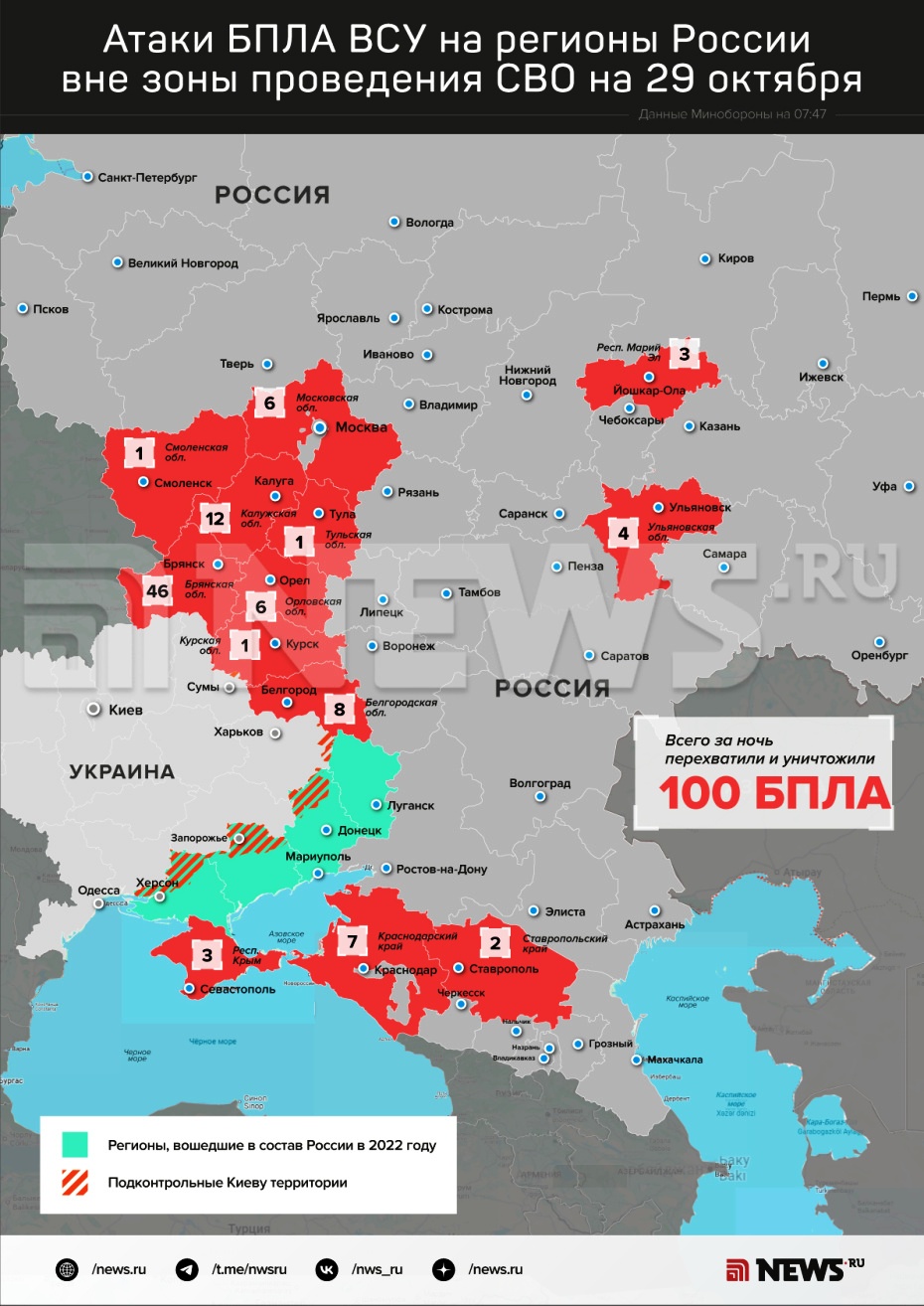 Враг продолжил атаку уже сегодняшней ночью. Дроны были пущены широким фронтом – от Крыма до Москвы. По информации военного ведомства, атаке с воздуха подверглись 13 российских регионов. В массированном налете было задействовано 100 дронов.