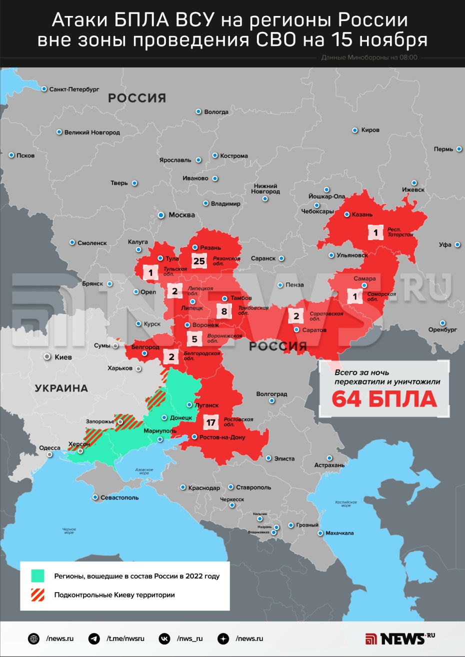 Атаку восьми дронов пресекли боевые расчеты ПВО в Тамбовской области, пять беспилотников врага было сбито над территорией Воронежской области. По два дрона сбили подразделения ПВО в Белгородской, Саратовской и Липецкой областях. По одном украинскому дрону было ликвидировано в Тульской и Самарской областях, а также в Татарстане.