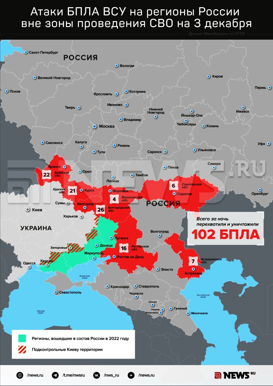 По данным Минобороны России, всего за эту ночь было перехвачено и уничтожено 102 украинских беспилотника самолетного типа. При этом 26 сбили над территорией Белгородской области, 22 — в брянском ребе. Еще 21 вражеский дрон ликвидировали силы ПВО в Курской области, семь — над Астраханской областью. Шесть БпЛА были нейтрализованы над Саратовской областью и четыре — в Воронежской области.