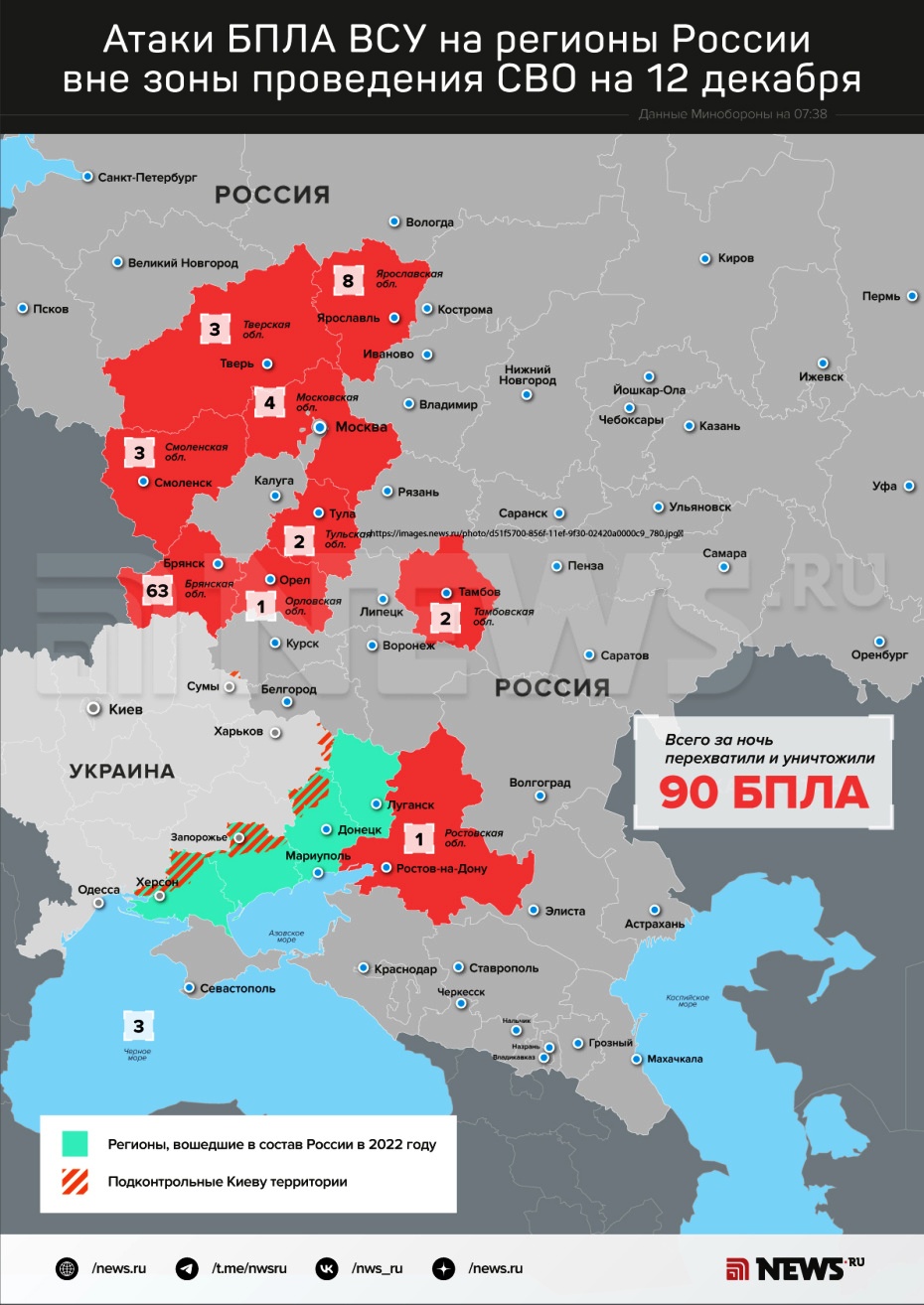 По данным Минобороны РФ, за эту ночь над девятью регионами страны и над Черным морем было сбито 90 украинских ударных БпЛА самолетного типа. Большинство дронов – 63 – уничтожили в брянском небе. Еще десять были ликвидированы во время попытки прорваться к Москве.