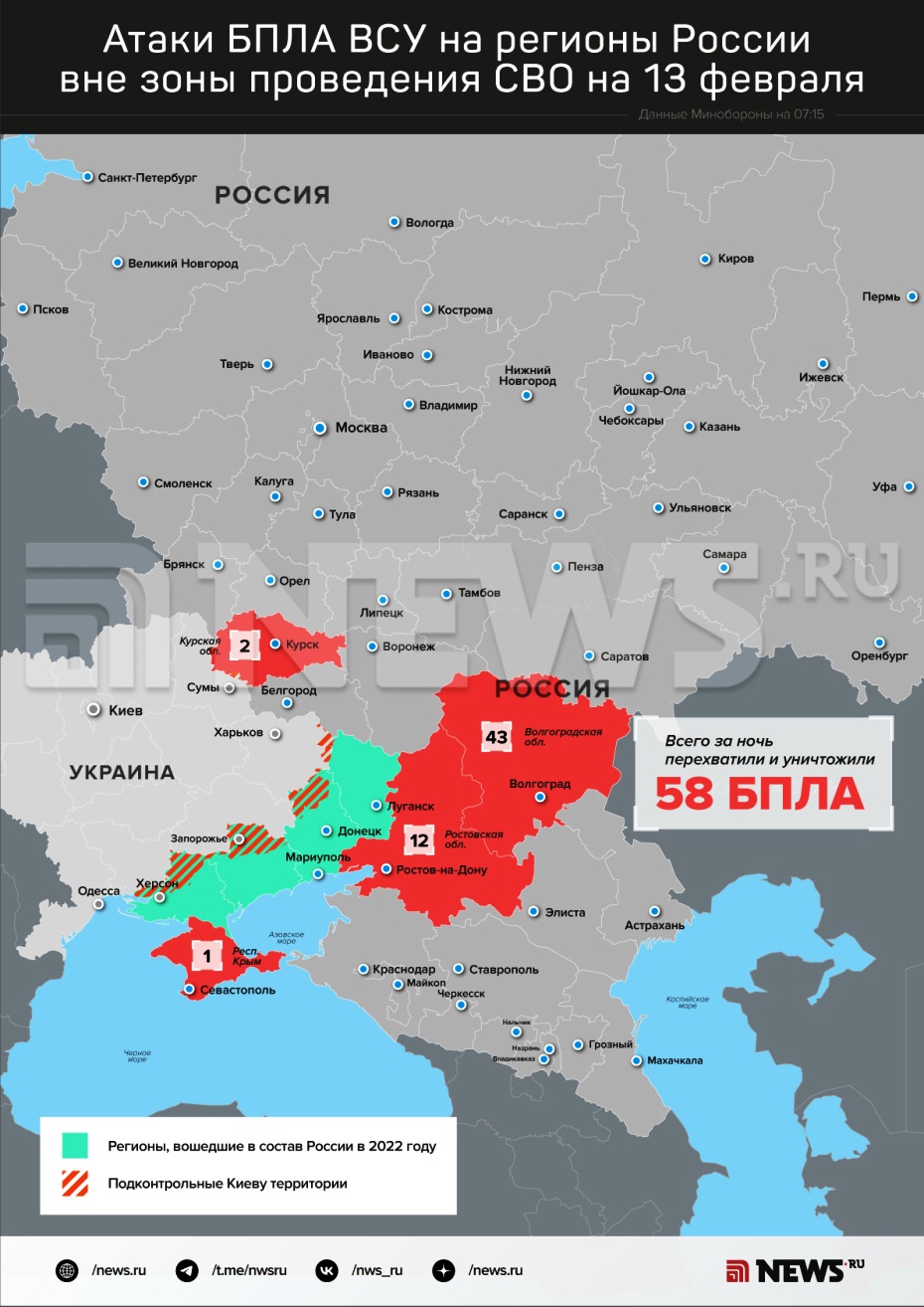Атаки противника были также отражены в Курской, Белгородской, Волгоградской, Астраханской областях и в Крыму. В общей сложности за минувшие сутки в небе над Россией было сбито 137 ударных беспилотников ВСУ.