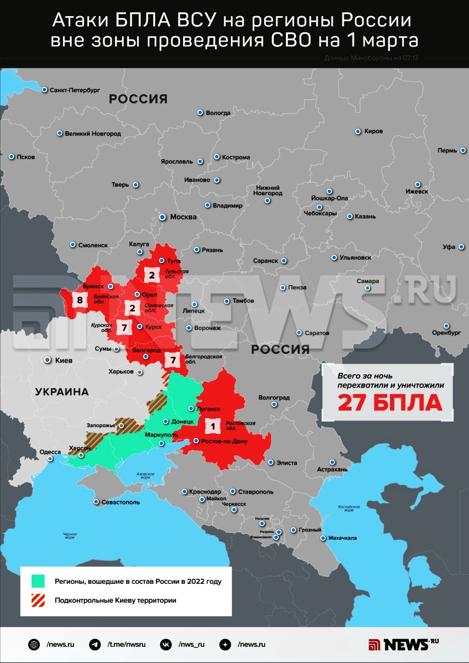 Информацию о пресечении на Дону беспилотной атаки подтвердило в своей утренней сводке и Министерство обороны России. Согласно сведениям военного ведомства, в ночь на 1 марта шесть регионов Европейской России были атакованы 27 неприятельскими ударными БпЛА самолетного типа. Помимо Ростовской области, беспилотники были сбиты над территориями Брянской (8), Белгородской (7), Курской (7), Тульской (2) и Орловской (2) областей.