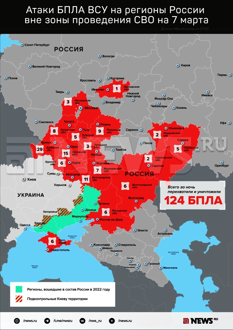 Наиболее массированный налет неприятеля приняла на себя Брянская область. Ее попытались атаковать 29 дронов. Еще 15 сбили в эту ночь над Орловской областью, 11 — над Белгородской, девять — над Рязанской, восемь — над Калужской, семь — над Воронежской, по шесть — над Курской и Волгоградской областями и Крымом. Пять украинских дронов были ликвидированы над Тульской и Самарской областями, по три — над Липецкой областью и Подмосковьем, в том числе один БпЛА, прорывавшийся к Москве. По два беспилотника расчеты ПВО уничтожили над Саратовской и Ульяновской областями и один был сбит над территорией Ивановской области. Ростовскую область, как уже было сказано, попытались атаковать шесть неприятельских дронов.