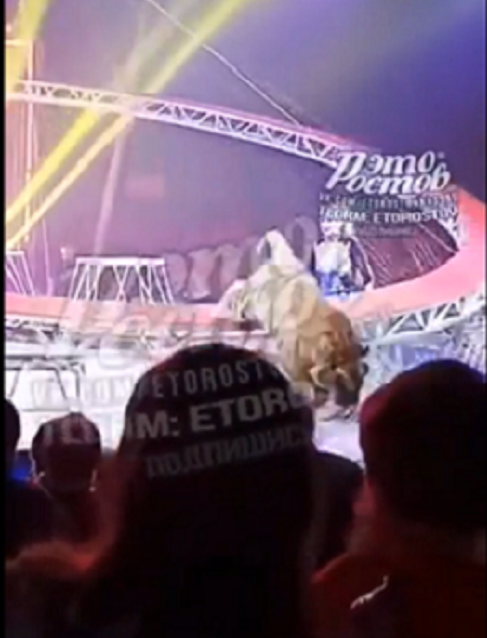 Все произошло сегодня в цирке шапито на проспекте Нагибина. Во время представления один из тигров испугался падения защитной сетки-манежа и, перепрыгнув через нее, рванул в ряды зрителей, Как сообщает РИА «Новости» со ссылкой на портал 161.ru, в этот момент на арене находились еще два тигра и два дрессировщика