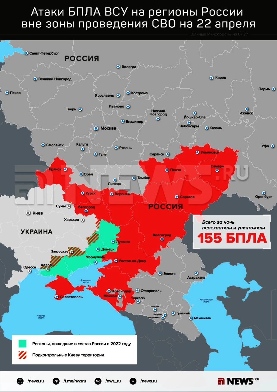 Как уточнили в Минобороны РФ, помимо Ростовской области, беспилотной атаке подверглись еще 11 регионов Европейской России. Ночью и утром боевые расчеты ПВО сбили 155 боевых украинских БПЛА самолетного типа. Атаки дронов были отражены в Воронежской, Белгородской, Курской, Брянской, Самарской, Саратовской, Пензенской и Ульяновской областях, а также в Краснодарском крае. Кроме суши, беспилотники противника были уничтожены над водами Черного моря.