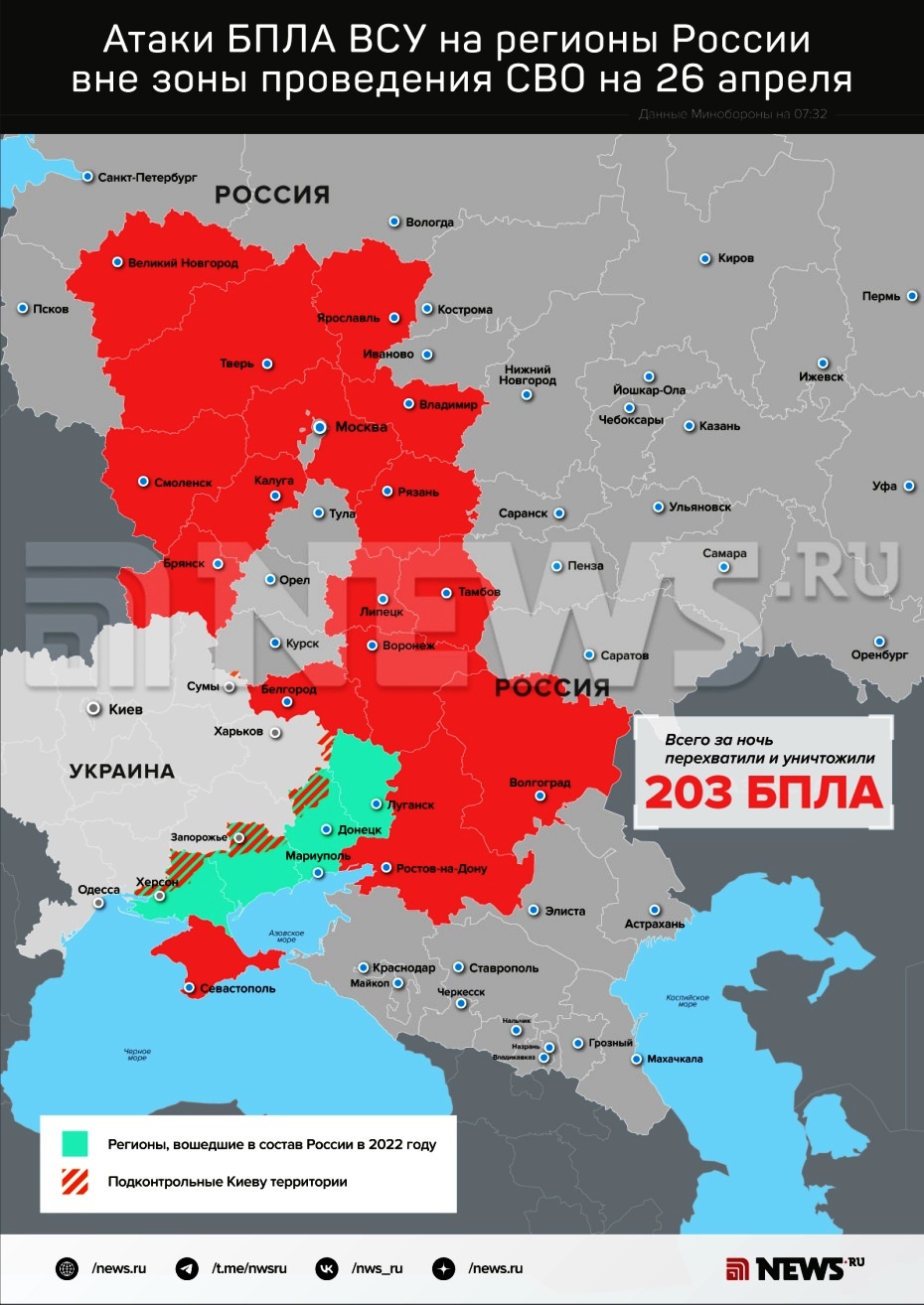 А тем временем дежурные подразделения ПВО уже сегодня утром, с 7.00 до 9.00, сбили над российскими регионами еще 49 украинских дронов. Атаки противника пресечены над Белгородской, Вологодской, Ярославской областями, в Крыму и над Черрным морем. Таким образом, в ходе всех трех волн налета, число ликвидированных вражеских беспилотников приблизилось к трем сотням.