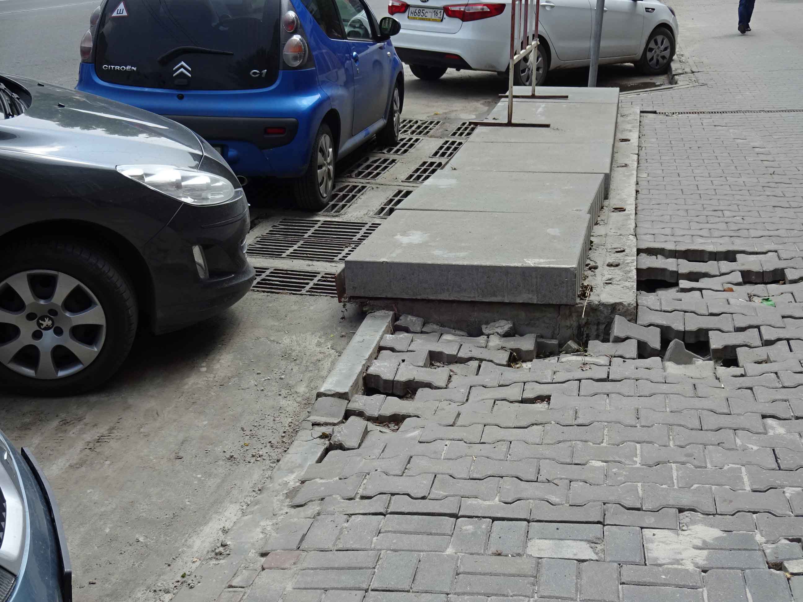 Нет, победной реляции не будет, увы. После ремонта плиточное покрытие опять повреждено. И даже без нивелира видно, что приемная решетка ливневой канализации расположена ВЫШЕ, чем проезжая часть.