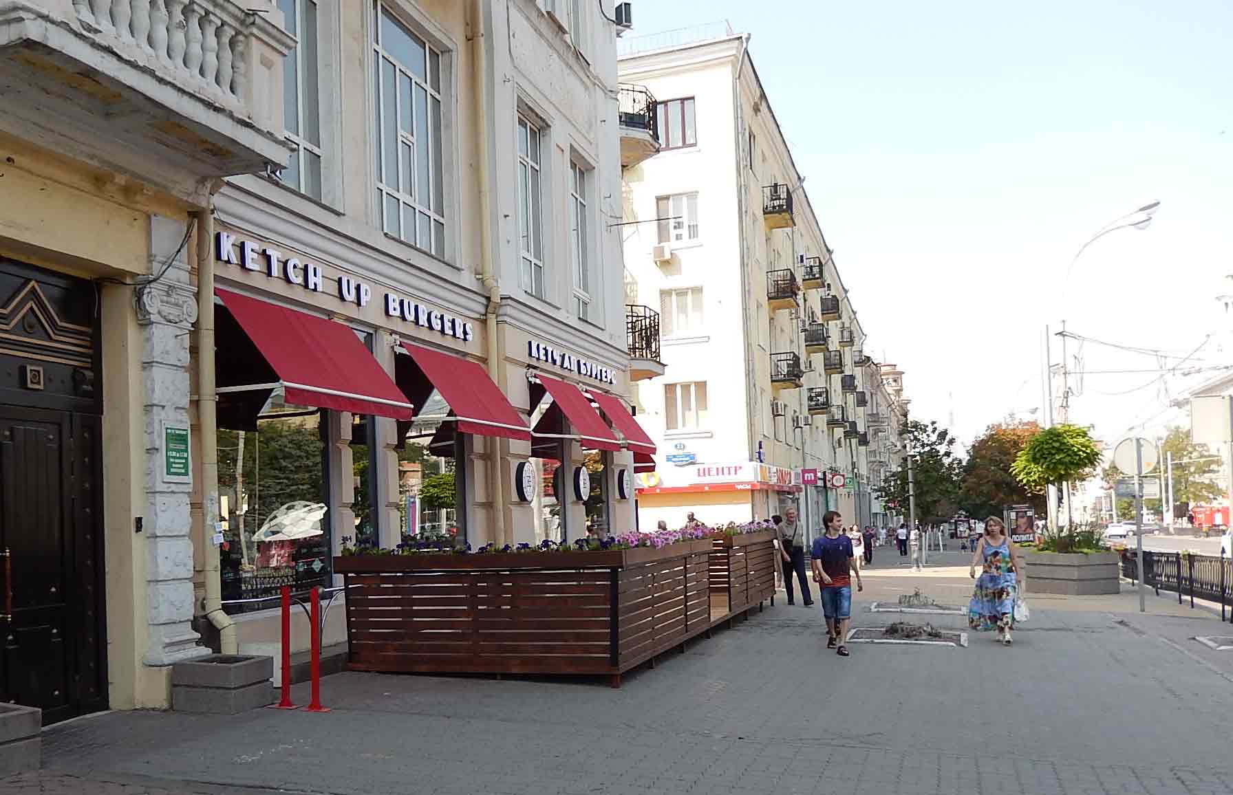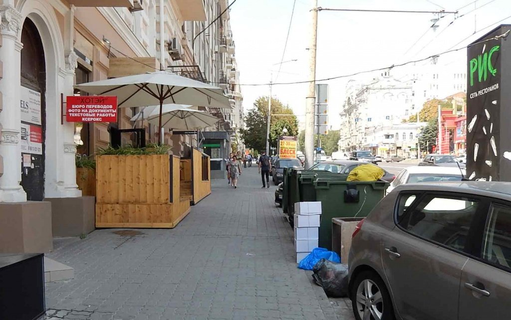 Добро бы еще, как на углу Большой Садовой и Буденновского, соорудили помост с навесом на газоне. Хотя какое же это «добро»? Газон-то уничтожен! Спасибо, хоть деревья оставили.