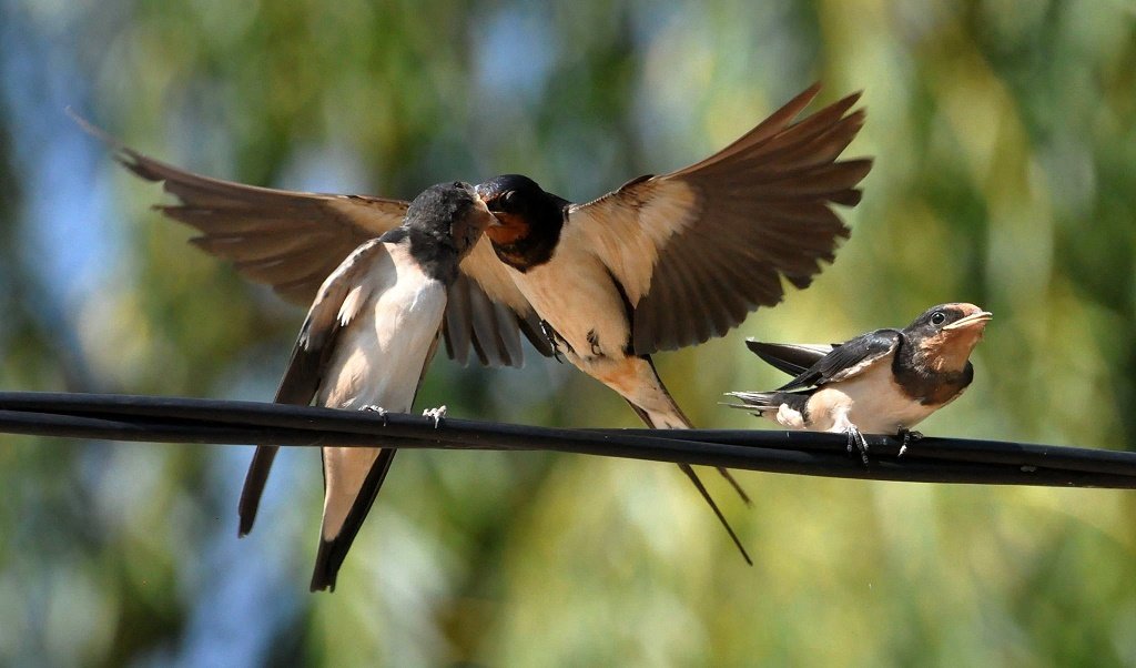 На снимке: перед дальней дорогой деревенские ласточки подкармливают птиц-подростков, так называемых слетков.