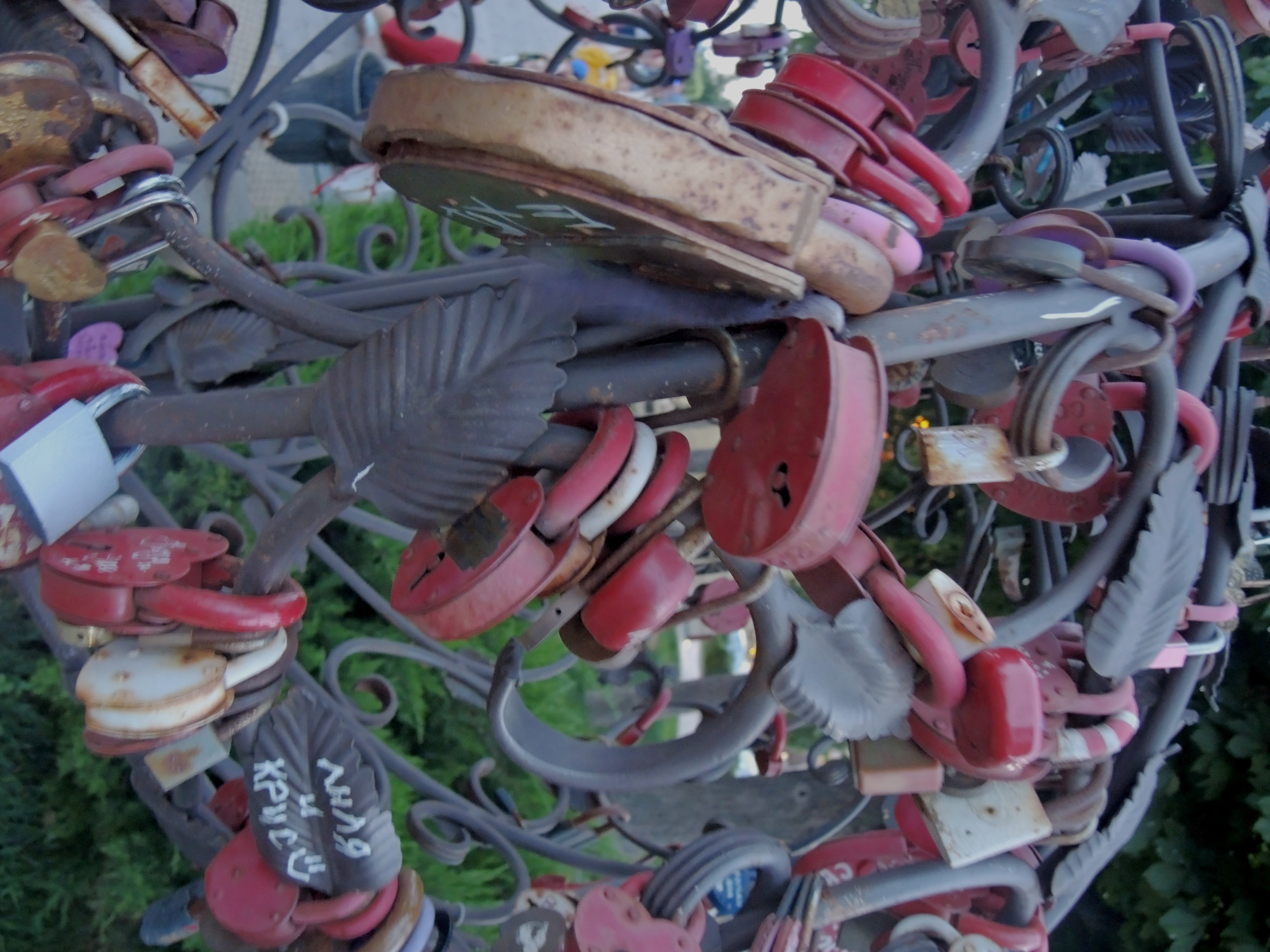 Магнитизм этого места просто зашкаливает - три невысоких, но солидных в диаметре "Древа..." столь плотно усыпаны замками, что для новых чугунных, латунных, стальных и алюминевых сердец, казалось, уже места не найдется. Ан нет - находятся. Новые парочки умудряются найти местечко и для своего проявления любви - именных замочков.