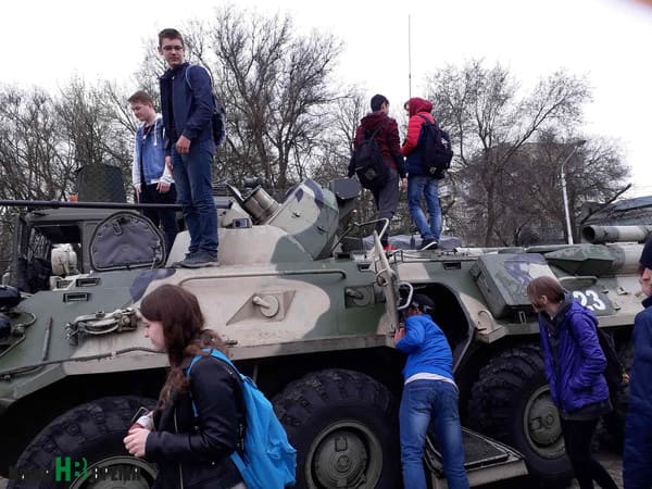 Здесь много школьников. Мальчишек, понятное дело, интересует военная техника. Кто-то пытается прицелиться из противотанкового гранатомета. Однако удержать тяжелый гранатомет с первого раза удается не всем. Но ребята проявляют настойчивость и добиваются цели. У БТР-82 – очередь. Каждый хотел бы посидеть за штурвалом боевой машины. «В БТРе помещаются 10 человек: 3 члена экипажа и 7 десантников», – рассказывает ребятам сержант Алексей КОЗЛОВ. Несмотря на вес 15 тонн бронетранспортер легко передвигается как по суше, так и по воде, развивая скорость 100 км в час.